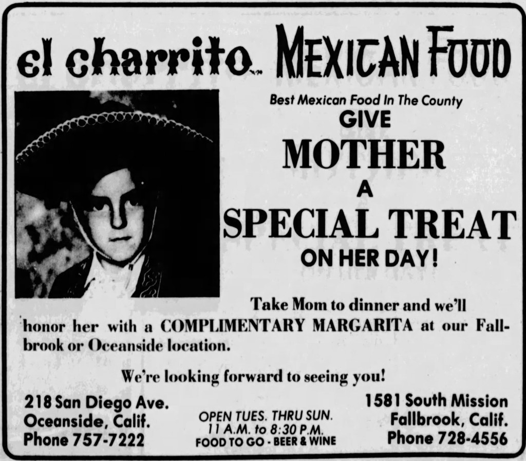 The Gobbi family opened El Charrito Restaurant in 1966 at 1426 Mission Avenue and about a year later moved it to 218 San Diego Street. This restaurant was a neighborhood focal point, much like the new recreation center, but it also brought customers from outside the boundaries of Eastside, for the authentic food and welcoming atmosphere.