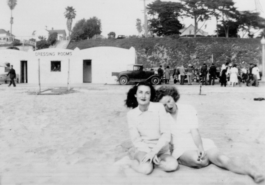Nadine McGill and Nadine Nadon in front of Dressing Rooms at the beach, 1946. Oceanside Historical Society