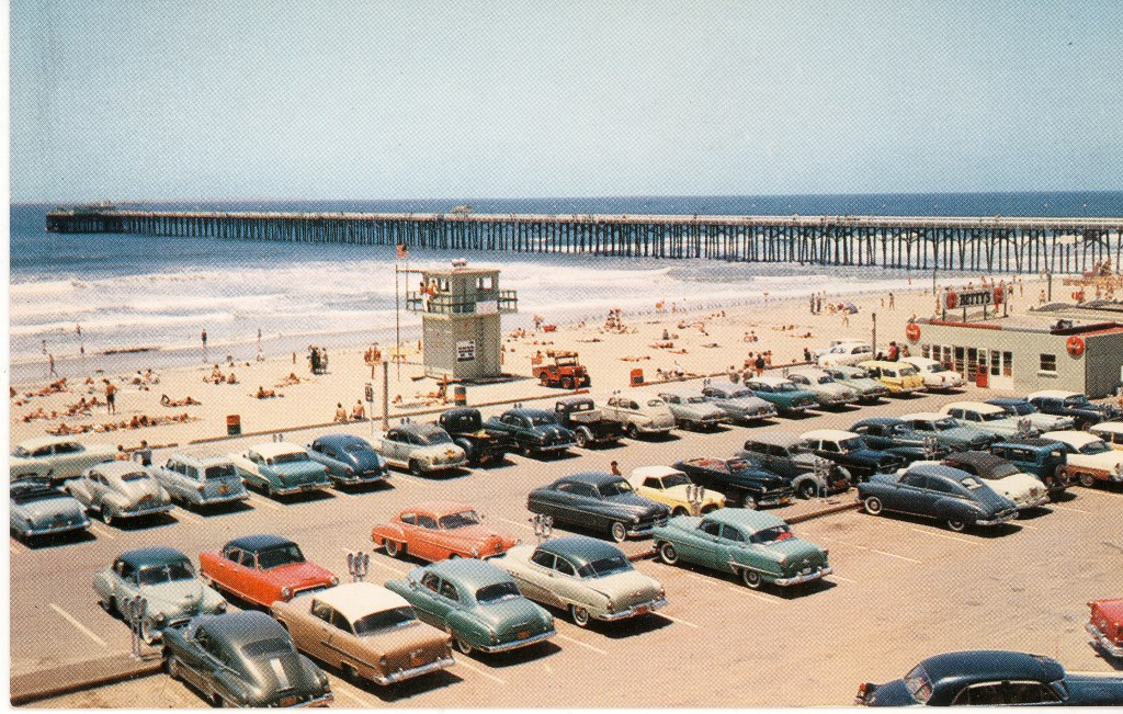 View of Oceanside Pier, parking lot and the dressing rooms, circa 1945. Oceanside Historical Society