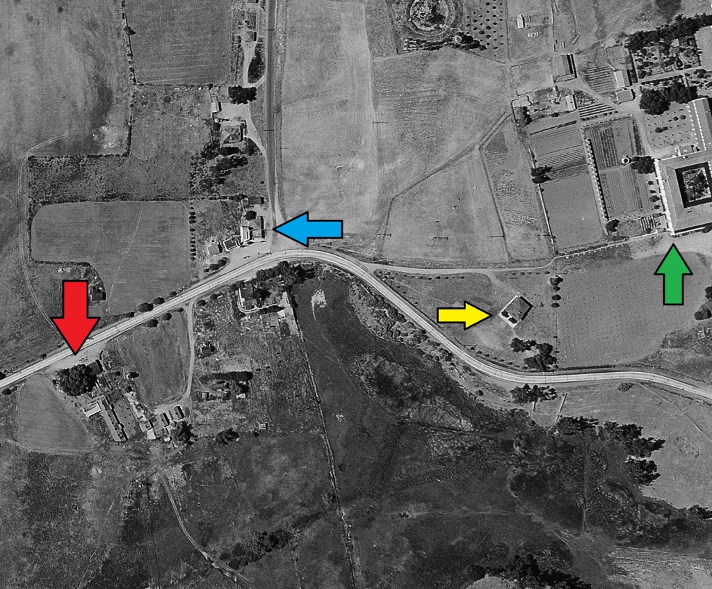 1937 aerial view of the San Luis Rey Township. The red arrow indicates the Mission Store location owned by Sager and what would become the Riverbottom Bar. The blue arrow is the present day San Luis Rey Bakery; the yellow arrow is the San Luis Rey Schoolhouse built on the grounds of the Mission, and the green arrow indicates the west portion of the Mission itself.