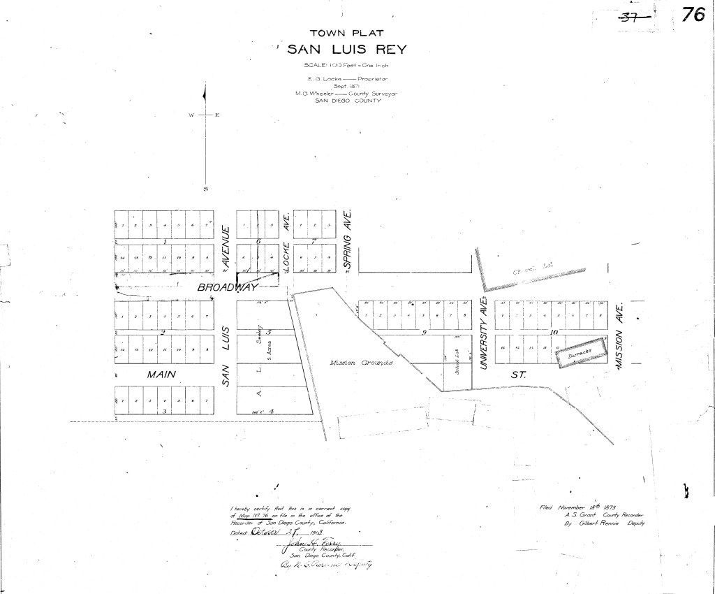 In 1873 E. G. Locke, who had been appointed postmaster in 1870, filed an official map of the township, of which he was listed as the proprietor. The township of San Luis Rey consisted of ten blocks and 7 streets. The street names no longer exist but were as follows: Main Street, San Luis Avenue, Broadway, Spring Avenue, University, Mission Avenue (not to be confused with the present-day road) and Locke Avenue, named after Elbridge G. Locke himself.