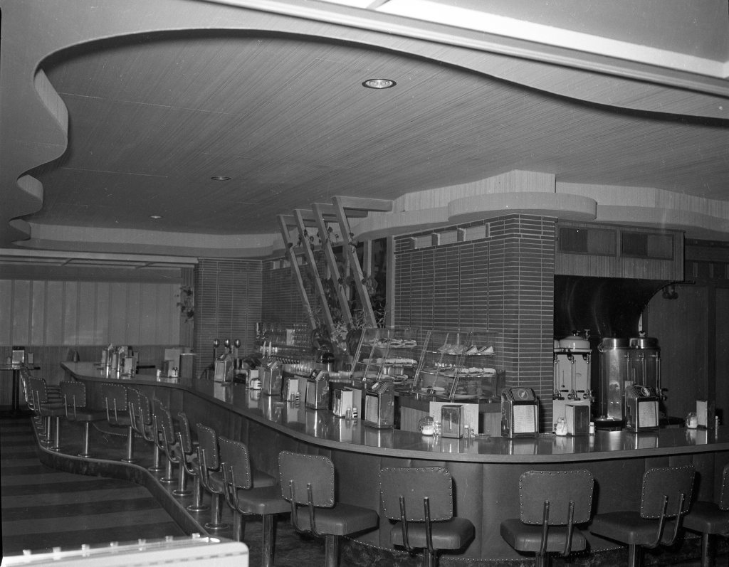 In 1967 the MiraMar Restaurant underwent remodeling, adding a new dining room, named the First Cabin, and a new coffee shop. The dining room offered banquet services for parties up to 120 and was decorated in “dark walnut paneling and heavy beamed ceilings.” A nautical motif continued with “sailing ships, barometers and ship telegraph” and an open flame Franklin fireplace.