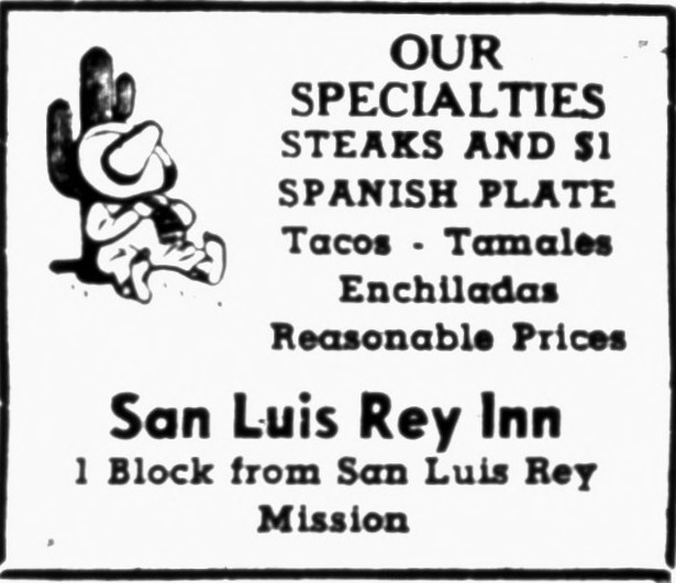 The San Luis Rey Inn remained a popular eatery in the 1950s offering customers “specialty steak and one dollar Spanish plates” of “tacos, tamales enchiladas at reasonable prices.”