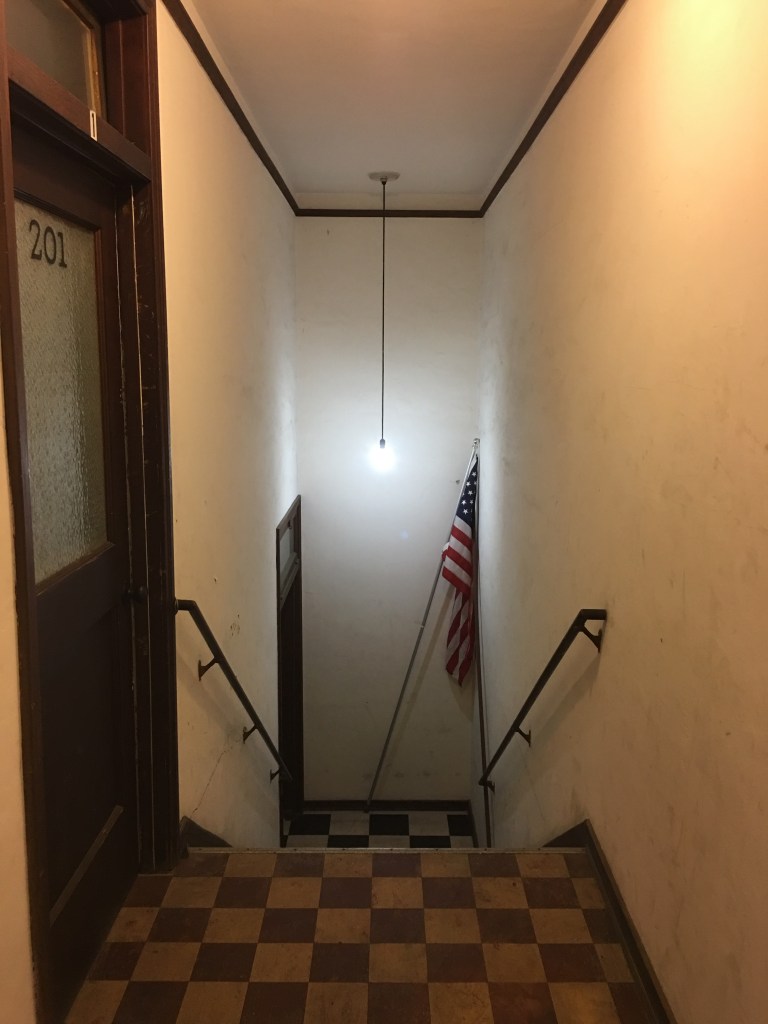 The house was photographed in 2013. Below are some interior scenes after the house had been vacant. The house had been remodeled over the years but there were still original features.