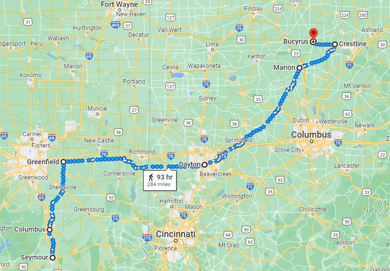 Route from Seymour Indiana to Bucyrus, Ohio in 1925