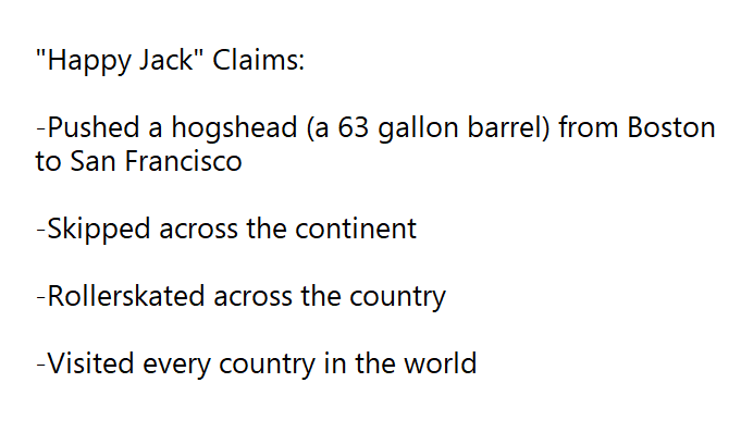 But “Happy Jack” was not finished. It seems he started over OR more likely just kept his ruse going, traveling to towns he had not yet visited with the same story. No doubt this was a continuation of the “original contest” or journey, but no one seemed to know or realize.